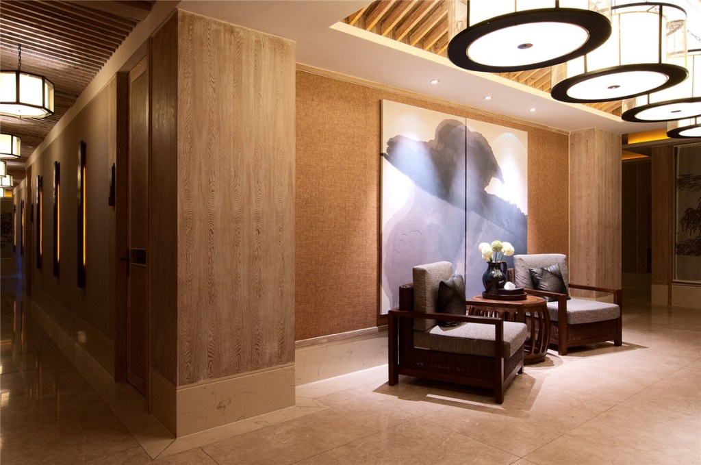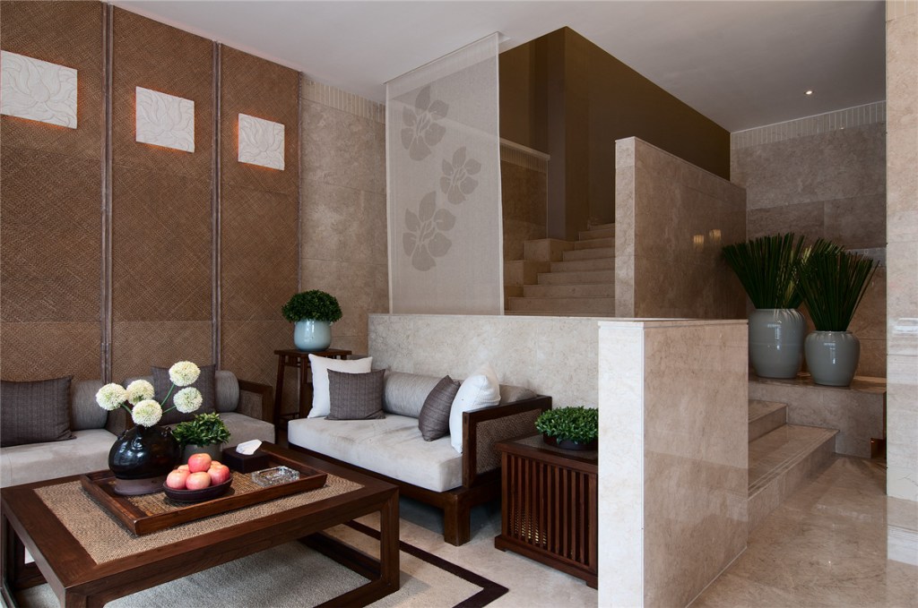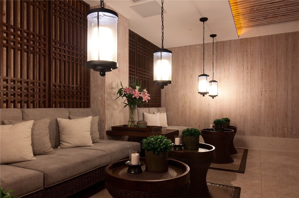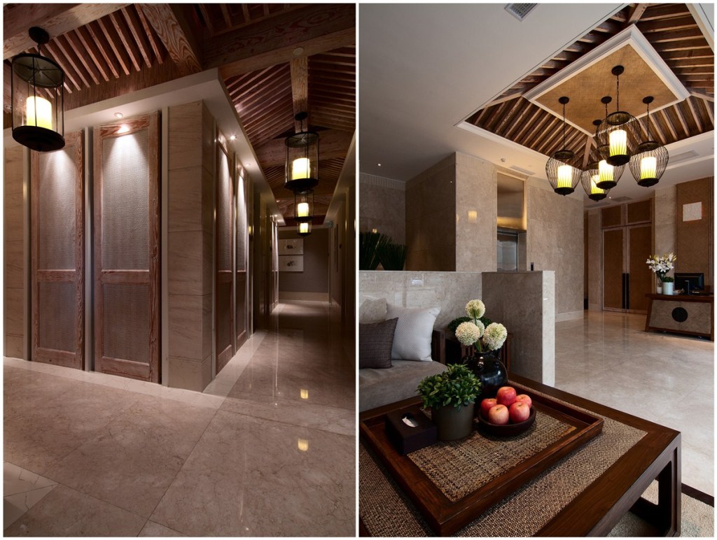 - Elements such as woodgrain patterns, stone textures, and intricate decorative screens enhance the space’s refined elegance while maintaining a cozy ambiance.