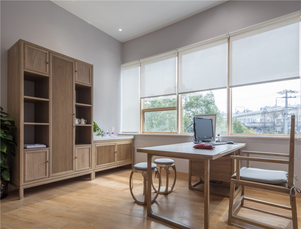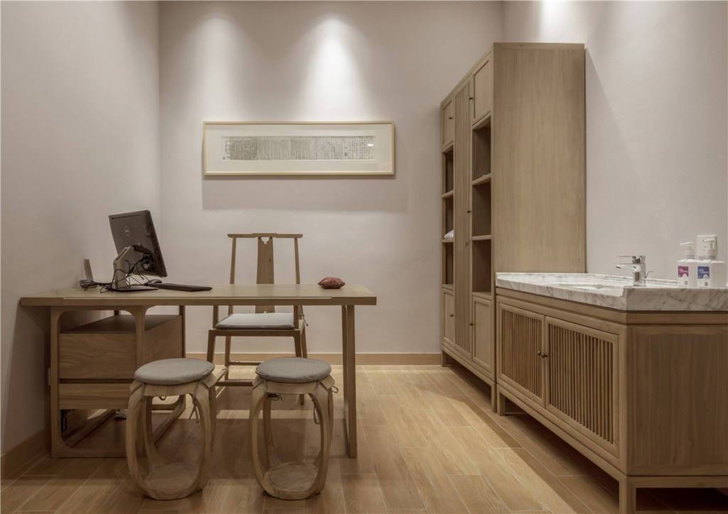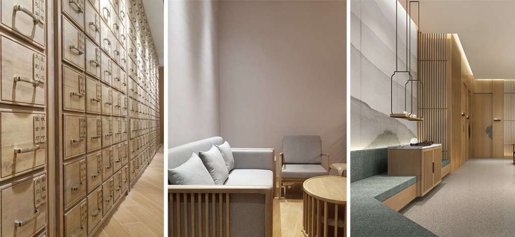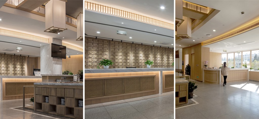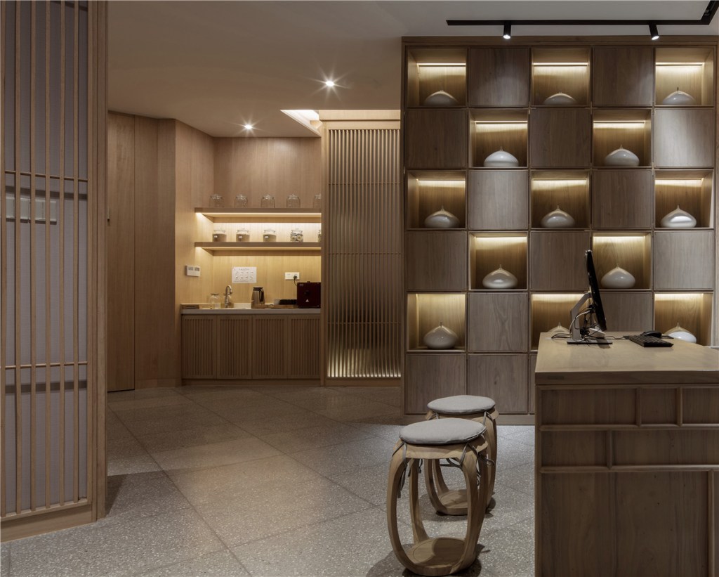 The open ceilings and natural materials used for shelves and tables embody the heritage of traditional medicinal spaces. The transparency of the materials invites natural light to flow freely, enhancing the natural feel and creating a seamless connection to the outdoors. Classic wood materials are chosen for their solid, grounding qualities, exuding timeless charm while showcasing the beauty of traditional craftsmanship under the gentle glow of the lighting.