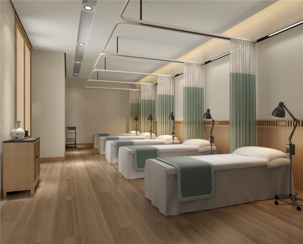 Whether for traditional medicine consultations or wellness treatments, this clinic radiates a serene and comforting atmosphere. The wide, open layout diverges from the typical, confined image of medical clinics, replacing it with a bright and orderly environment that speaks of warmth and care. Rich, detailed textures, soft lighting, and warm tones create a soothing ambiance, echoing the depth and precision of traditional Chinese healing methods.