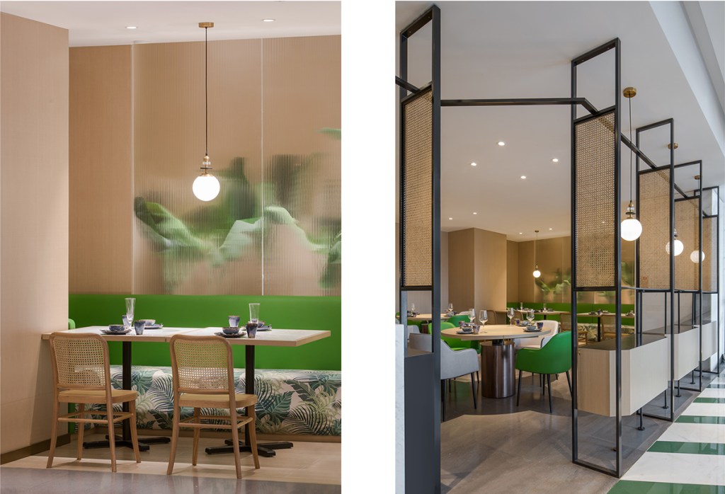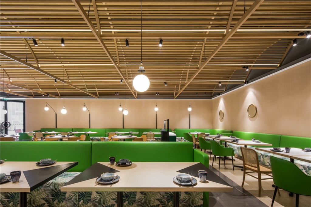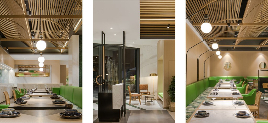 - Interior – The Waves: The main dining area is wrapped in warm wood tones and intertwined with vibrant green accents. The ceiling undulates like waves of the Andaman Sea, offering varied dining experiences—some clear and open, others intimate and dreamlike.