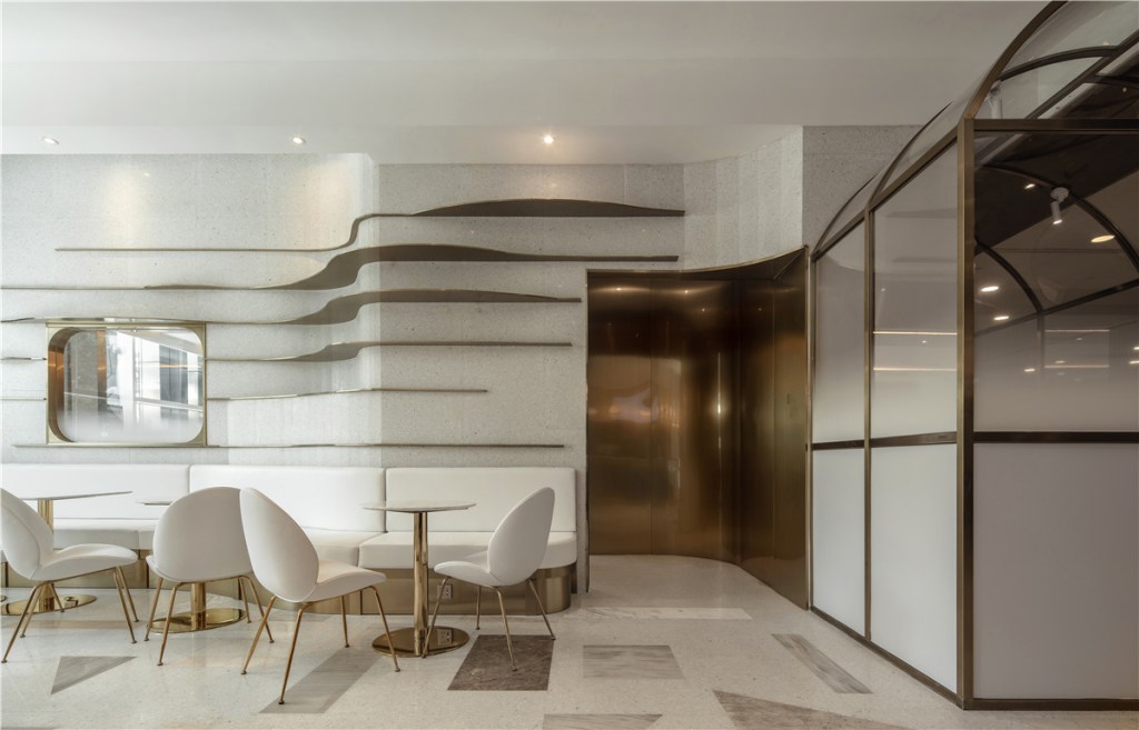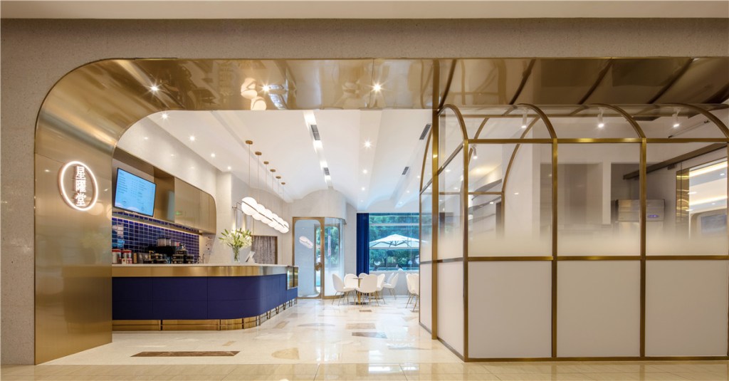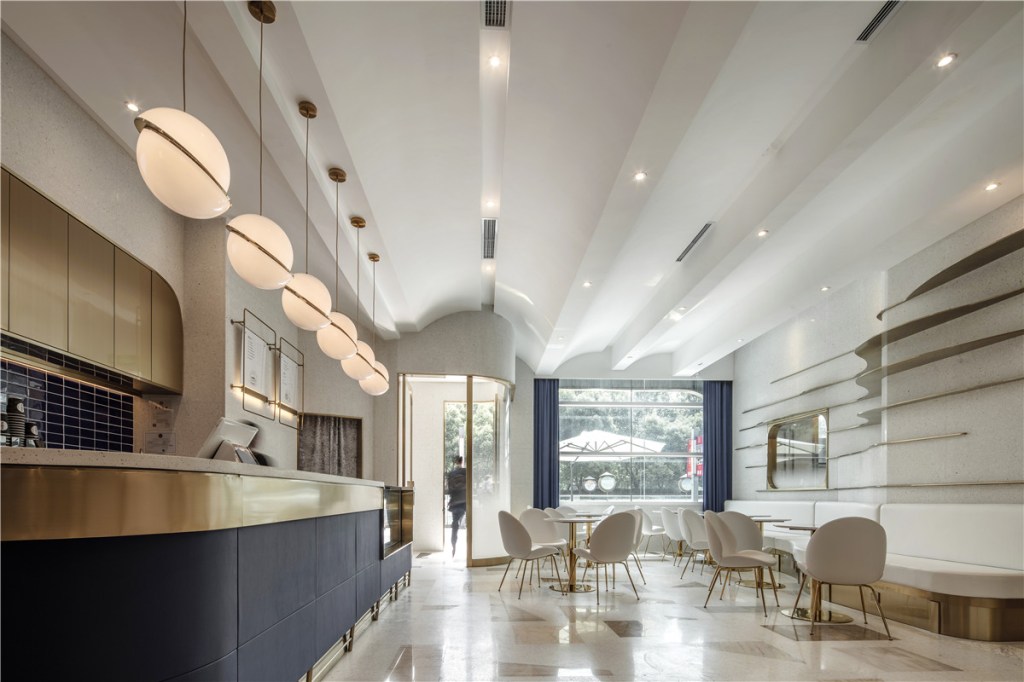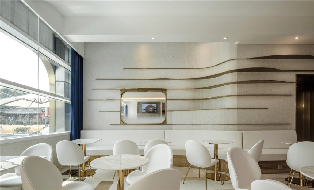 Inspired by the exquisite desserts served at Xingyao Hall, the café area is envisioned as a “dessert-like” space. Simple geometric shapes unify the design, exuding elegance and modernity.